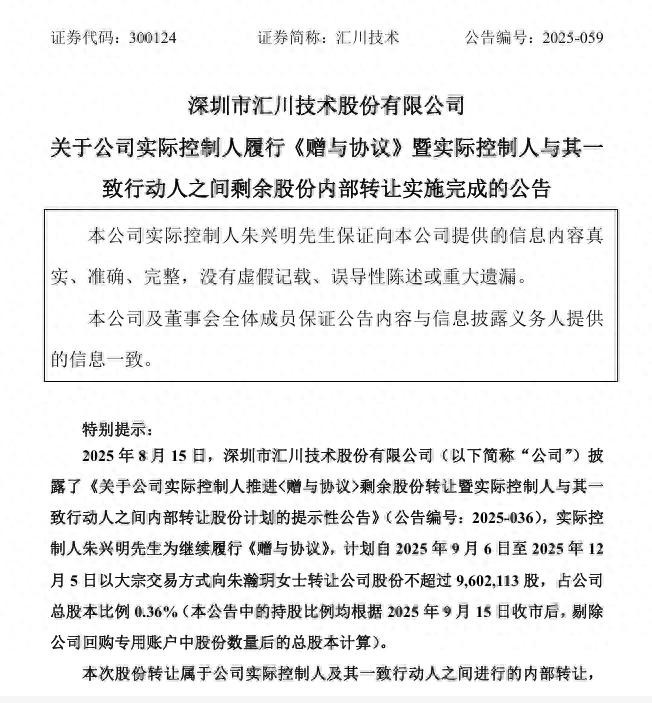 2024年12月,朱兴明以大宗交易的方式向朱瀚玥转让公司股票1100万股。2025年9月,《赠与协议》中约定的剩余960.21万股汇川技术股票完成了内部转让工作。